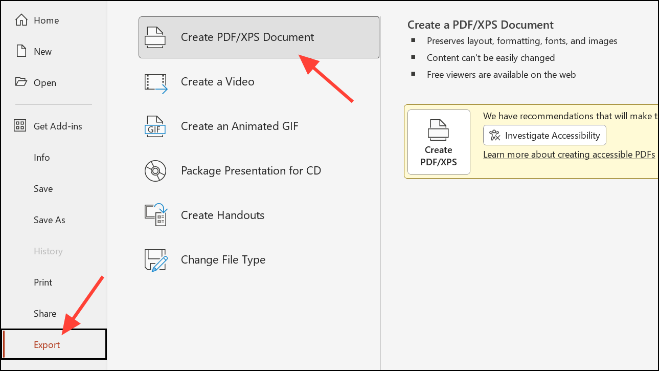 Después de crear su diagrama de flujo, puede exportar su diapositiva o la presentación completa como PDF para compartirla fácilmente. SeleccionarFile > Export > Create PDF/XPS Documentpara generar una versión portátil de alta calidad de su diagrama. También puede copiar y pegar su diagrama de flujo en otras aplicaciones, o guardar su diapositiva como una imagen haciendo clic derecho en la diapositiva en el panel de miniaturas y eligiendoSave as Picture.