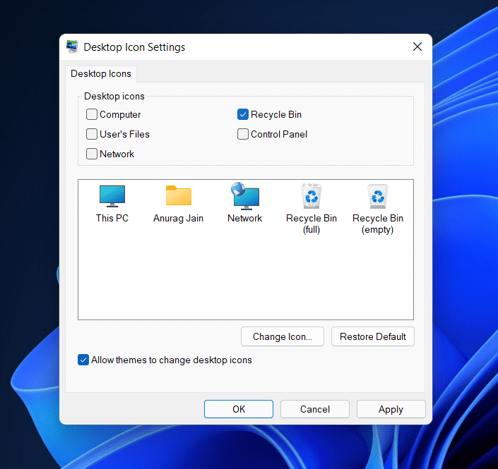 - En la ventana emergente que se abre, marque la casilla justo al ladoPapelera de reciclaje, haga clicenAplicary haga clic enDE ACUERDOpara guardar los cambios.