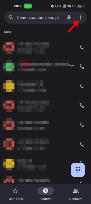 2. Cuando se abra la aplicación Teléfono, toque eltres puntosen la esquina superior derecha.