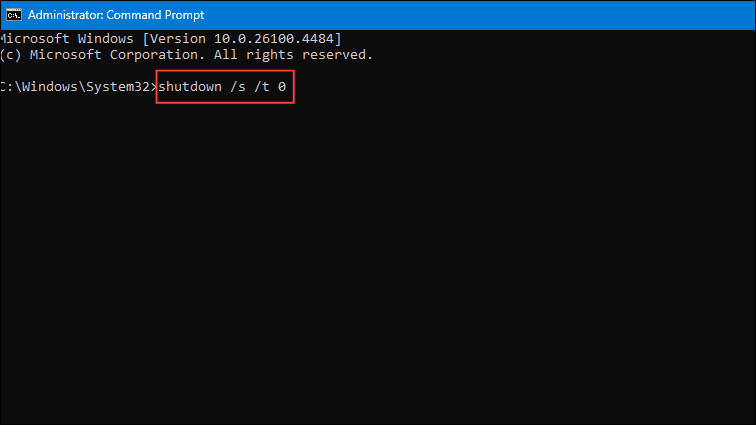 Paso 2:En la ventana del símbolo del sistema, escribashutdown /s /t 0y presioneIngresar. Este comando le indica a Windows que se apague inmediatamente, omitiendo el proceso de actualización.