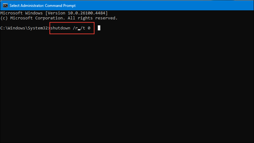 Paso 3:Si necesita reiniciar en lugar de apagar, useshutdown /r /t 0del mismo modo.