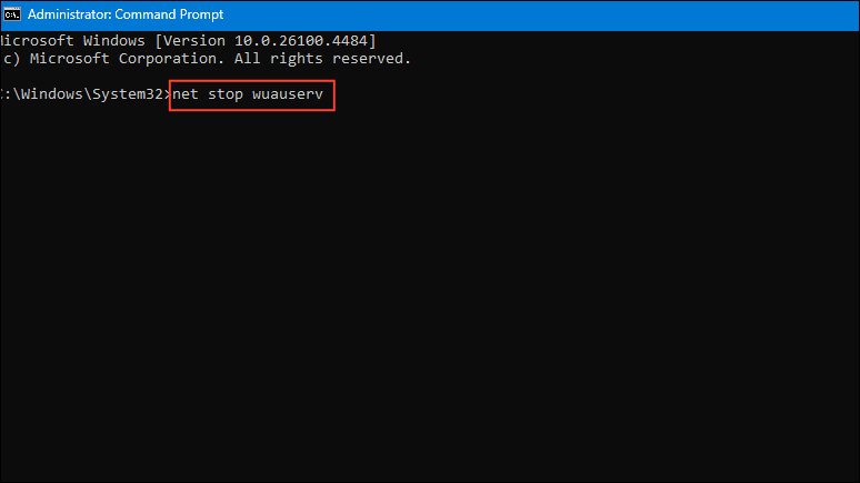 Paso 2:En el símbolo del sistema, ingresenet stop wuauservy presioneIngresarpara detener el servicio de actualización de Windows. Luego escribenet stop bitsy presioneIngresarpara detener el Servicio de transferencia inteligente en segundo plano.