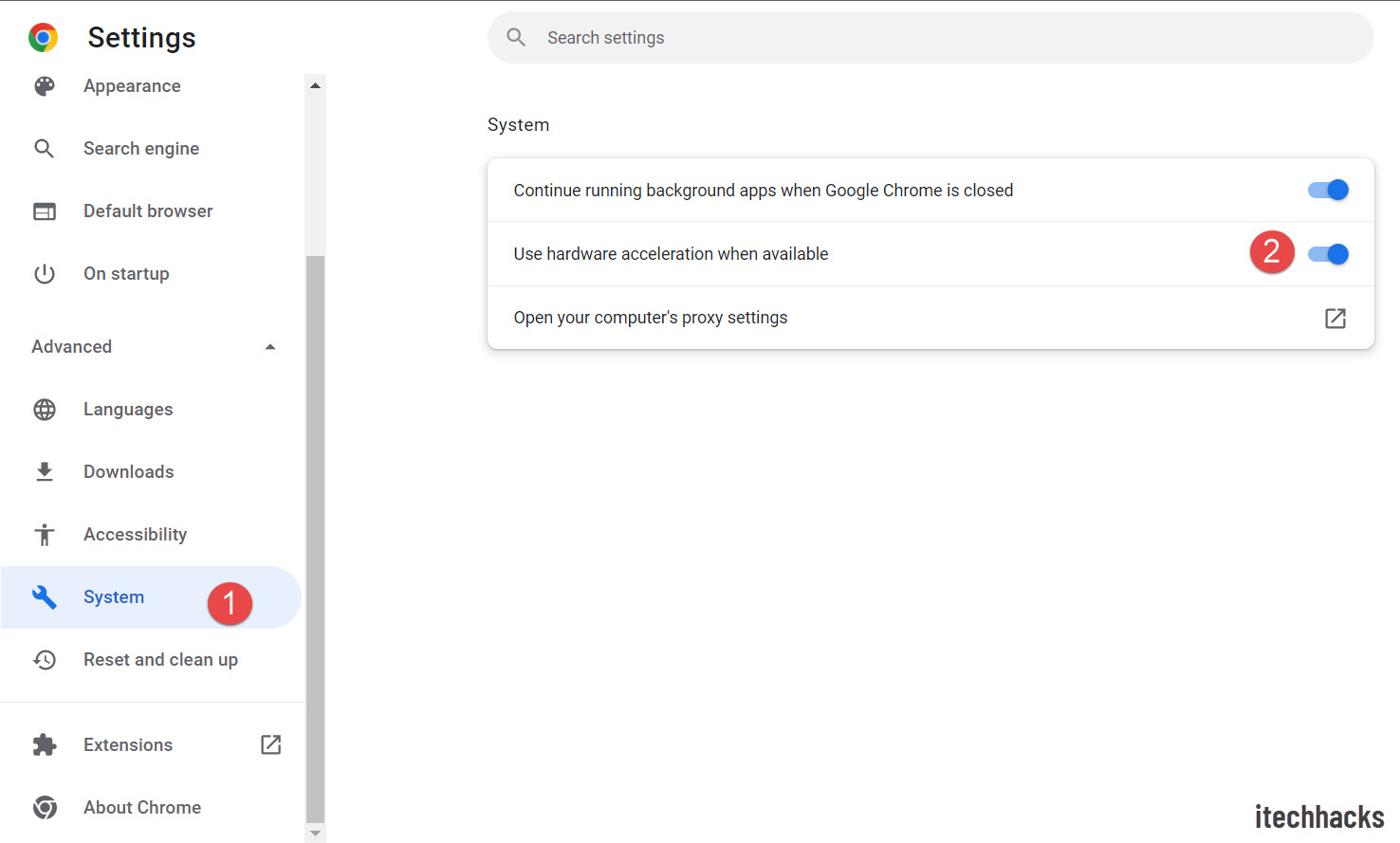 - En elAjustes, buscarUtilice la aceleración de hardware cuando esté disponibley desactivarlo.