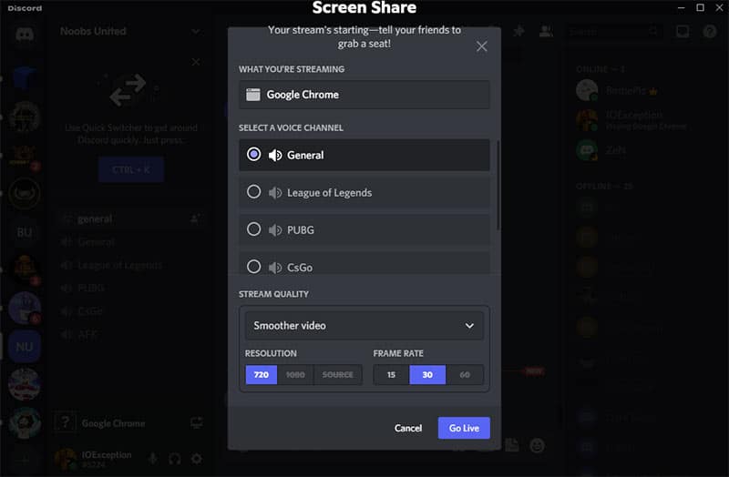 - Elige tuCalidad de transmisión(resolución y velocidad de fotogramas). Nota: Las opciones de mayor calidad, como 1080p y 60 FPS, requieren unaSuscripción a Discord Nitro.