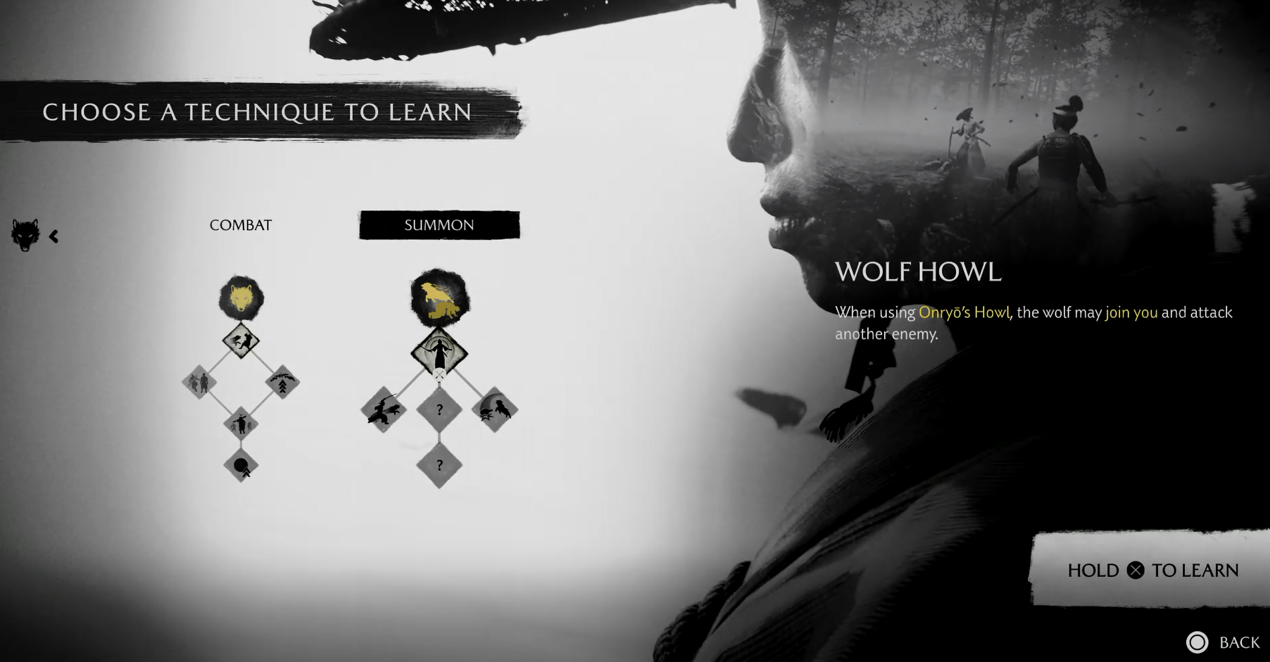 - Para interactuar, inclínate ante el altar; Esto abre la pantalla de técnica, donde seleccionas y confirmas una nueva habilidad.