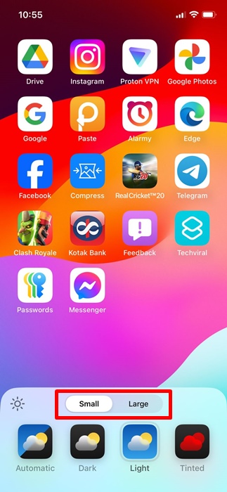 5. Aparecerá un menú en la parte inferior que le permitirá seleccionar entre unPequeñoy ungrandeicono de la aplicación. Si elige el ícono grande, los nombres de los íconos de las aplicaciones estarán ocultos.