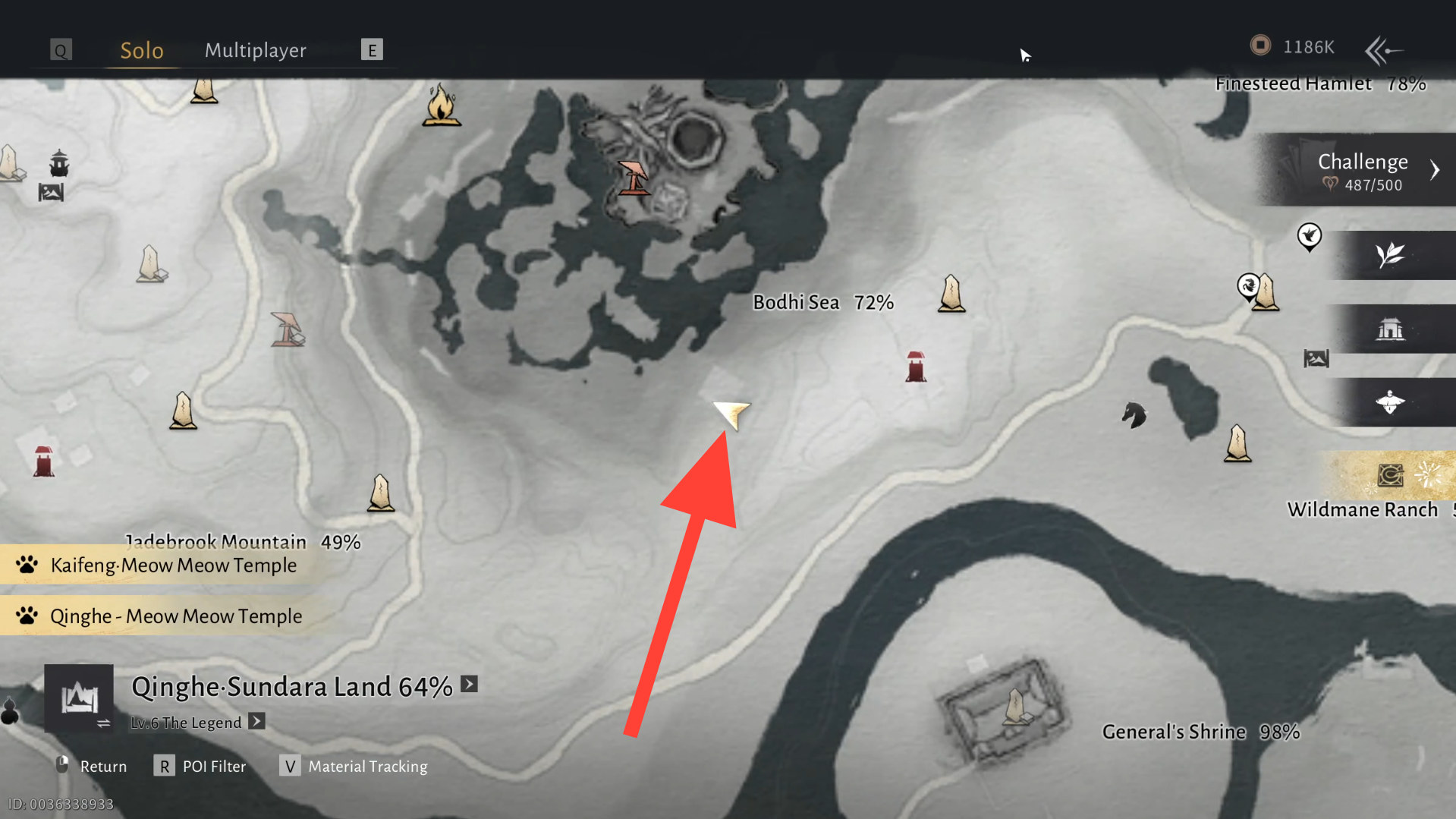 Vaya a la siguiente ubicación marcada a continuación, cerca del Límite del Monasterio Bloomveil y encuentre a Wang Er parado junto al borde del acantilado. Usa Celestial Seize para robarle las Citas II de Miaoshan.