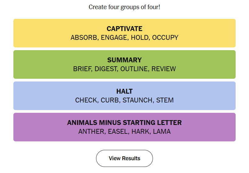 El rompecabezas de Conexiones de hoy combina lenguaje, lógica y creatividad en perfecta armonía. Desde estar absorto y comprometido hasta recortar los pensamientos en una breve reseña, y luego cambiar de marcha para controlar o frenar el flujo, todo condujo a un final divertido con animales ocultos sin su carta inicial.