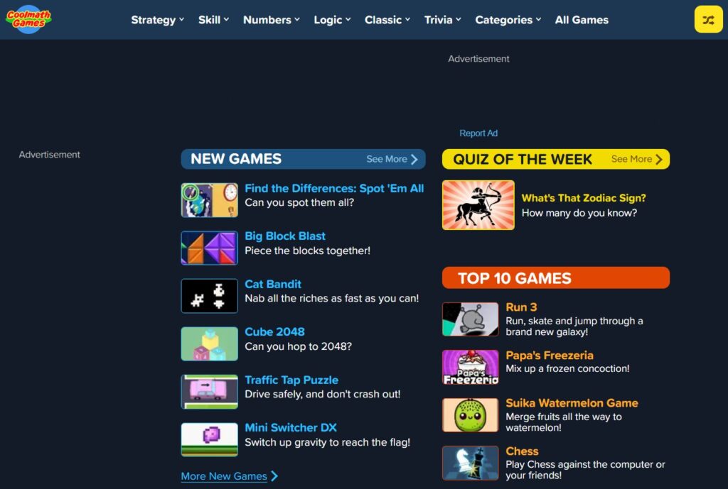 Coolmath Games es uno de esos sitios icónicos de juegos educativos que son tan divertidos como educativos. Con frecuencia no está bloqueado en las escuelas, ya que muchos de sus juegos se basan en lógica, acertijos o matemáticas.