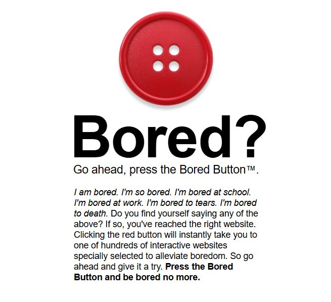 BoredButton no es un sitio de juegos promedio. Es una herramienta aleatoria que abre sitios web interesantes, juegos divertidos y herramientas interesantes con un clic.