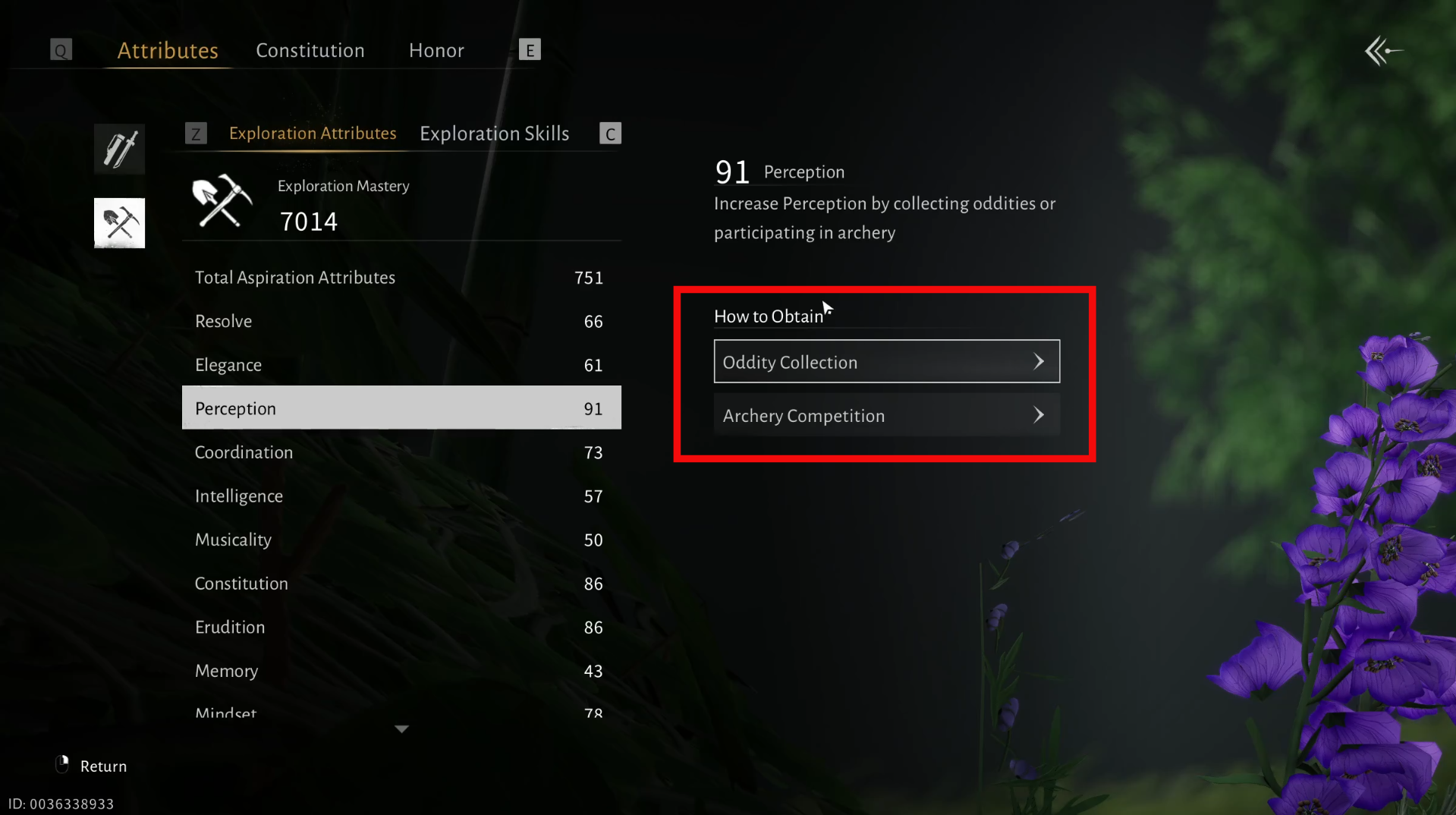 La percepción se puede obtener haciendo Oddity Collection o competencias de tiro con arco.