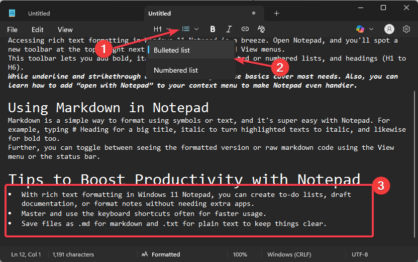 - Con el formato de texto enriquecido en el Bloc de notas de Windows 11, puede crear listas de tareas pendientes, borradores de documentación o formatear notas sin necesidad de aplicaciones adicionales.