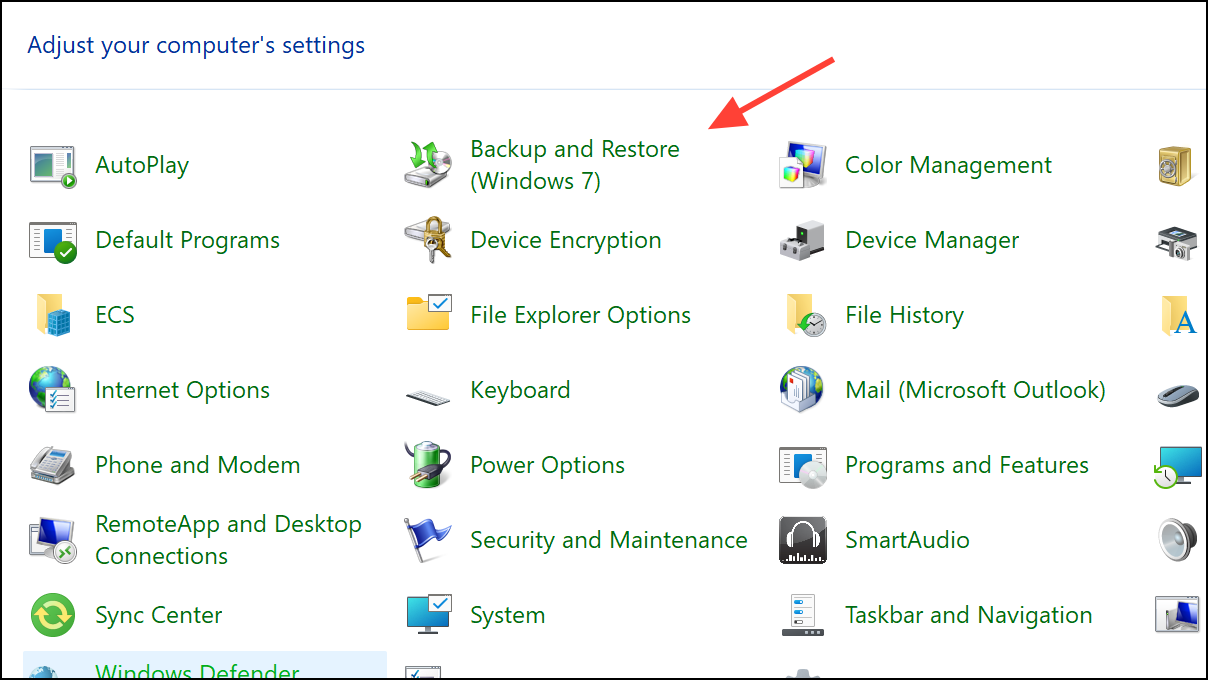 Paso 2:Abra el Panel de control y seleccioneCopia de seguridad y restauración (Windows 7).