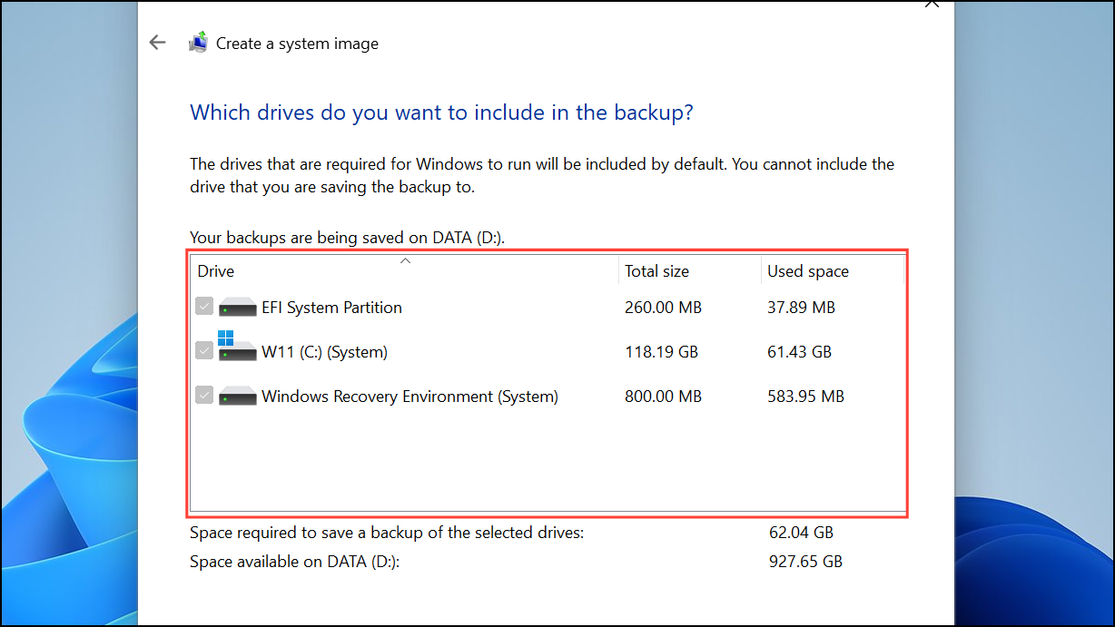 Paso 4:En la página siguiente, verá los componentes de los que se realizará una copia de seguridad en su disco externo y cuánto espacio utilizarán.