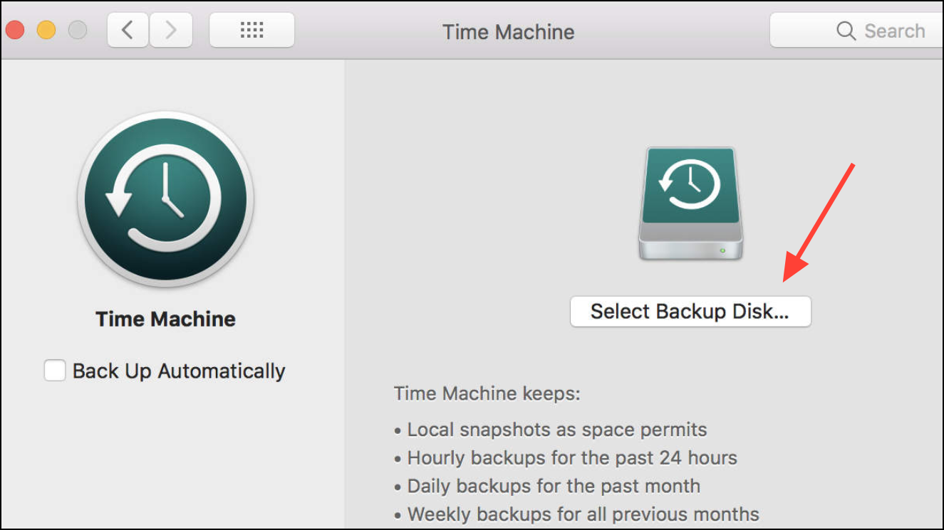 Paso 3:Hacer clicSeleccionar disco de respaldo, elija su disco duro externo y confirme su selección. Time Machine ahora estará habilitado para esta unidad.
