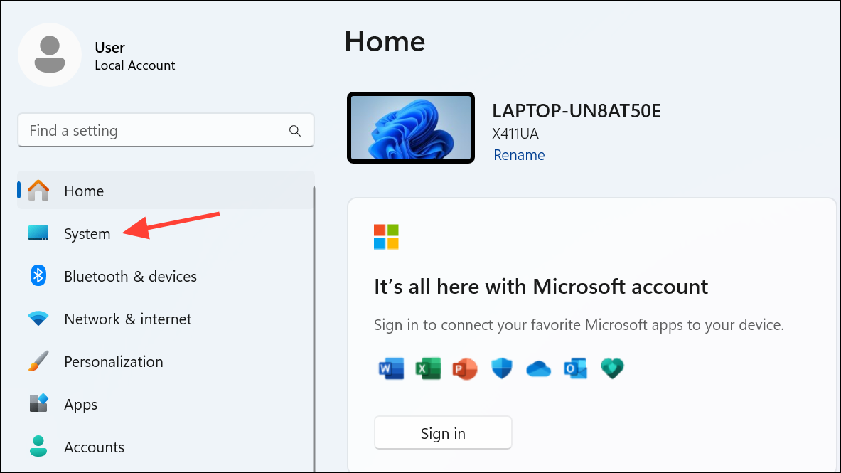 Paso 1:Abra la aplicación Configuración presionandoWin + Iy luego seleccione "Sistema".