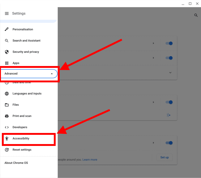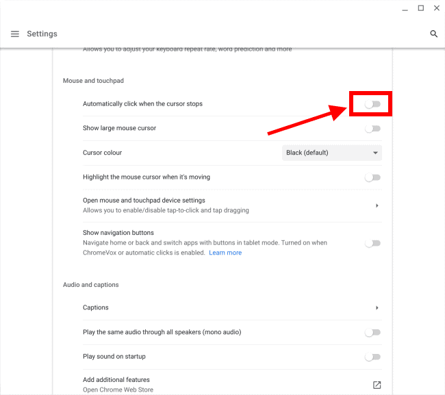 Primero, puedeshabilitar la configuración de clic automáticoen tu PC con Chrome. Este método funciona porque las computadoras con sistema operativo Chrome tienen configuraciones de clic automático incorporadas.