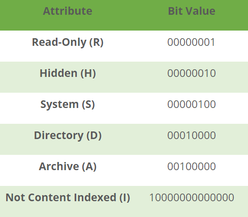 A continuación se muestra la lista de atributos de archivos comúnmente utilizados y su valor de bit correspondiente.