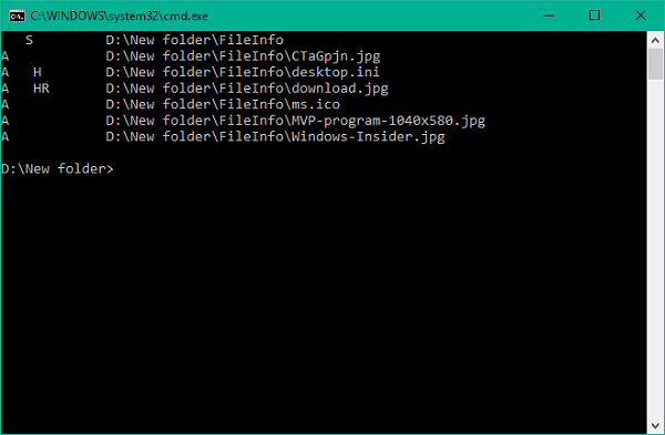 A continuación se muestra una imagen de ejemplo donde he mostrado todos los atributos de una carpeta, su subcarpeta y también los archivos. Apareció una ventana CMD que muestra todos los atributos de la carpeta.