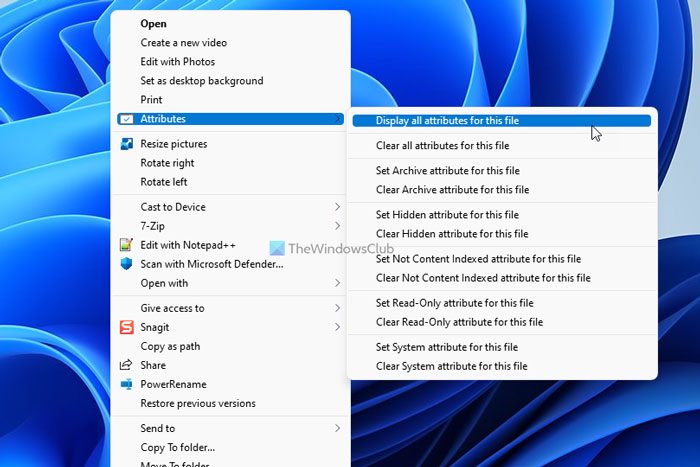 Solo descarga, extraiga su contenido y ejecute el apropiado con privilegios de Administrador para agregar/eliminar las entradas del registro. Ahora, para acceder a estas opciones desde el menú contextual, simplemente haga clic derecho en el archivo/carpeta deseado y navegue hastaAtributoselemento del menú allí. Seleccione la opción del submenú para la operación prevista.