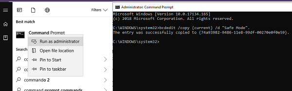 El comando agrega una entrada de Modo seguro en el menú de Inicio, lo que significa que puede iniciar Windows directamente en ese modo.