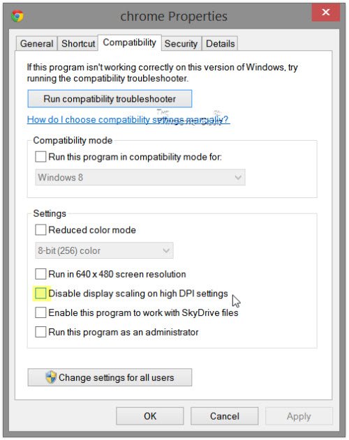 Seleccione la pestaña Compatibilidad. Aquí marque Deshabilitar la escala de visualización en configuraciones de DPI altas.