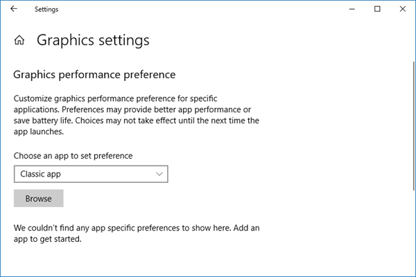 EsteTambién se introdujo en la actualización reciente y le permite personalizar el rendimiento gráfico de aplicaciones individuales. Puede seleccionar cualquier aplicación clásica o universal y definir la GPU que debe usar.