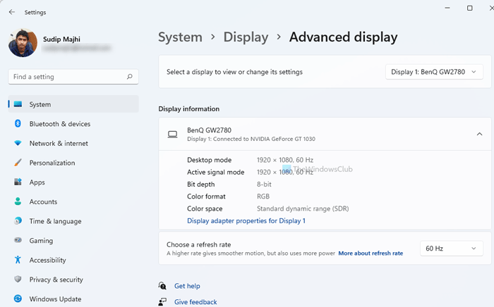 Esta página es completamente nueva y se agregó a Windows 11 v1803. Actualmente, esta página no ofrece mucho, pero parece que es un lugar donde Microsoft agregará más funciones. Actualmente, la página Configuración de pantalla avanzada le informa sobre las pantallas que ha conectado a su computadora. Además, puede indicarle qué procesador de gráficos está alimentando una pantalla. Aparte de eso, muestra información básica como resolución, frecuencia de actualización, profundidad de bits, formato de color, espacio de color, etc.