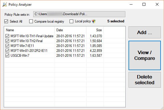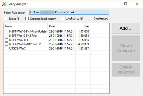 Para agregar un conjunto de reglas de política a la colección del Analizador de políticas, haga clic en el botón Agregar como se muestra arriba en la ventana principal. Aquí, agregué los conjuntos de GPO de muestra tomados de las líneas base de configuración de seguridad de Microsoft proporcionadas anteriormente como parte del archivo de descarga.
