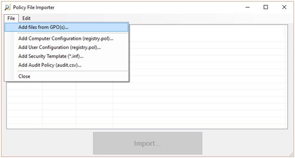 Policy Analyzer puede ingerir tres tipos de archivos GPO: archivos de políticas de registro, plantillas de seguridad y archivos de copia de seguridad de políticas de auditoría. Consulte la captura de pantalla a continuación,