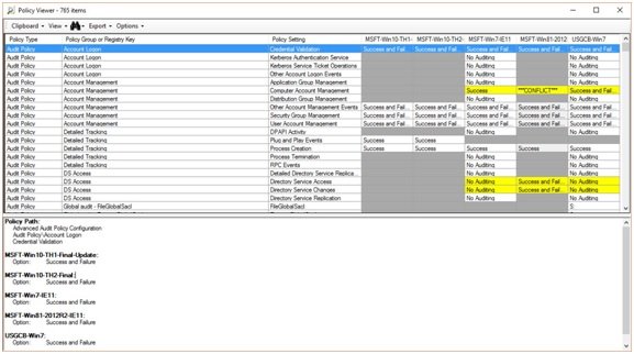 Los hallazgos del Analizador de políticas se muestran en una tabla donde las áreas resaltadas en amarillo muestran "Conflicto", mientras que las celdas grises indican configuraciones ausentes. El hallazgo también se puede exportar a una hoja de cálculo de Excel para su uso posterior.