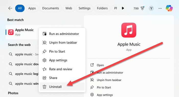 - Vaya a la barra de búsqueda, escriba Apple Music y haga clic derecho sobre ella.