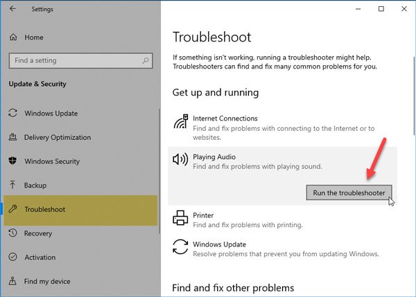 panel y busqueReproducción de audio. Haga clic en el botón que diceEjecute el solucionador de problemas. Después de eso, debe seguir las instrucciones en pantalla. En caso de que muestre una opción para elegir un dispositivo de audio, debe seleccionar su dispositivo de reproducción de audio predeterminado.