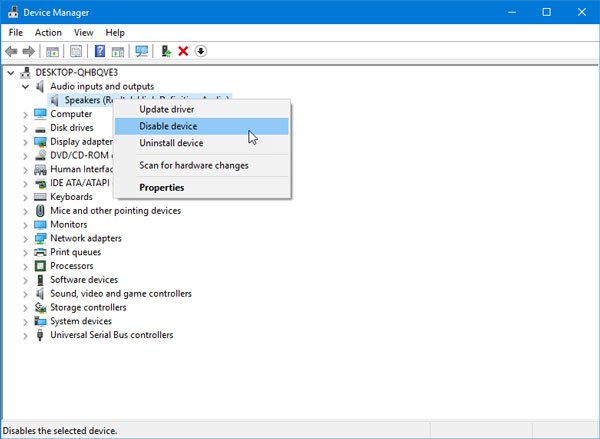 En la mayoría de los casos, puedes resolver este problema reiniciando el dispositivo de audio. Para hacer eso, debe abrir el Administrador de dispositivos. En el Administrador de dispositivos, expanda elEntradas y salidas de audioopción. Aquí debería encontrar el controlador de su dispositivo de audio. Haga clic derecho en eso y seleccioneDesactivar dispositivo.