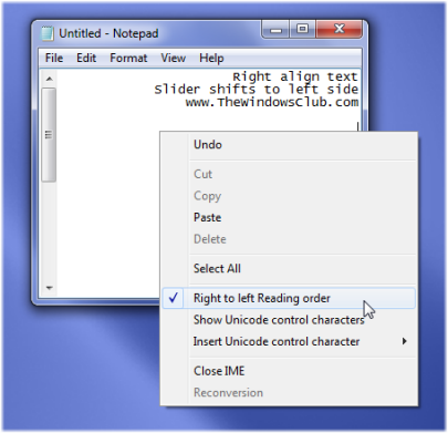 7) Para alinear el texto hacia el lado derecho,haga clic derechodentro del Bloc de notas y seleccioneOrden de lectura de derecha a izquierda.
