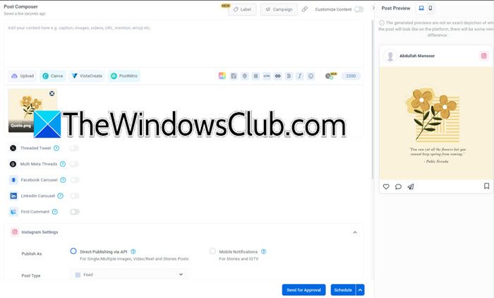 - Utilice el panel para explorar herramientas como la generación de subtítulos, el asistente de inteligencia artificial para generar ideas, Flick Editor y más para crear publicaciones adaptadas a la audiencia. Ahora, haga clic en Programador para planificar y automatizar publicaciones.