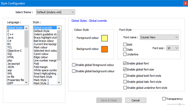Si cree que la interfaz predeterminada de Notepad++ es aburrida y necesita cierta personalización, ciertamente puede hacerlo sin utilizar ningún software o complemento de terceros. Es posible cambiar el tema, la familia de fuentes, el tamaño de fuente, el estilo de fuente, el peso de fuente, el color de fuente, el color de fondo y más. Si ha instalado una fuente de fuentes de terceros, aún puede usarla como fuente predeterminada en Notepad++. Para cambiar las preferencias, simplemente haga clic enConfiguración > Configurador de estilos. Verás una pantalla, donde podrás elegir todo lo mencionado anteriormente. Seleccione su preferencia y coloque una marca en la casilla de verificación en la misma página. De lo contrario, el cambio no se efectuará.