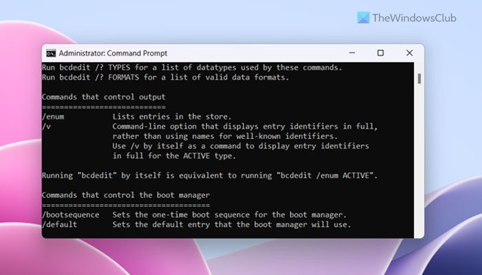 Para ver qué más puedes hacer conBCDEdit.exe, tipobcdedit.exe /?en el símbolo del sistema. Enumerará las opciones y operaciones completas que puede realizar con el editor BCD usando el símbolo del sistema.