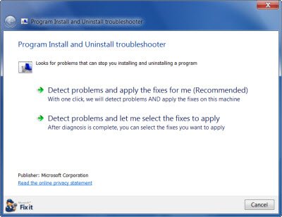 Microsoft ha lanzado unSolucionador de problemas de instalación y desinstalación de programasque diagnosticará automáticamente cualquier problema que pueda enfrentar al instalar o desinstalar programas o software en Windows 11/10. Esta herramienta le ayudará a solucionar problemas que bloquean la instalación o eliminación de programas. Puede desinstalar programas en Windows 1/1/10 que no se pueden desinstalar. Usando este solucionador de problemas de instalación y desinstalación de programas, si descubre que no puede instalar oa través de su Panel de Control.