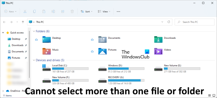 Si, por alguna razón, en el Explorador de archivos de Windows,No se puede seleccionar más de un archivo o carpeta., ya sea después de usar elopción de la pestaña Organizar oCtrl+Acombo de teclado, entonces puedes probar esto: