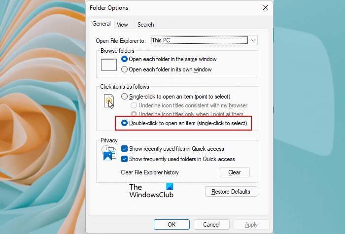- bajo elGeneralpestaña, seleccione laHaga doble clic para abrir un elemento (haga clic un solo clic para seleccionar)opción.