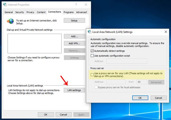 AbiertoPropiedades de Internetusando la barra de búsqueda y cambie a laConexionespestaña >Configuración de LANbotón.