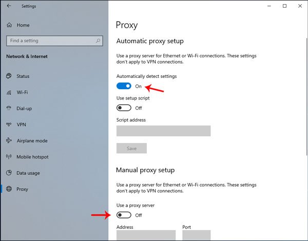 Si ha configurado un proxy manual en su sistema, debe desactivar la configuración del proxy manual y establecerla en los valores predeterminados de fábrica. Para hacer eso, abra el panel de Configuración de Windows 11/10 y vaya aRed e Internet>Apoderado. En su lado derecho, asegúrese de queDetectar configuraciones automáticamenteLa opción está activada y elUtilice un servidor proxyLa opción está desactivada enConfiguración manual del proxy.