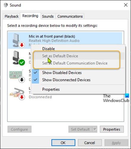 - Haga clic derecho en el dispositivo de grabación y haga clic enEstablecer un dispositivo predeterminado.
