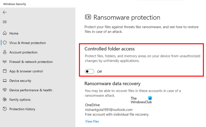 Puedes con bastante facilidaddesde la aplicación de seguridad de Windows. Para hacer lo mismo, abraSeguridad de Windowsdesde Inicio, navegue hastaProtección contra virus y amenazas > Administrar la protección contra ransomware,y luego habilitarAcceso controlado a carpetas.