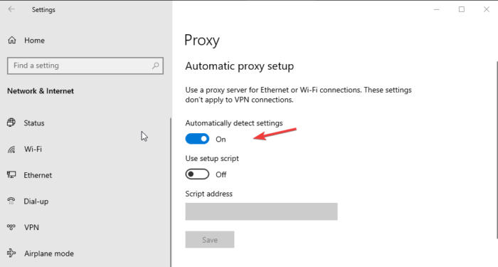 - Aquí, alterna elDetectar configuraciones automáticamentebotón encendido, así como elUsar script de configuraciónopciones.