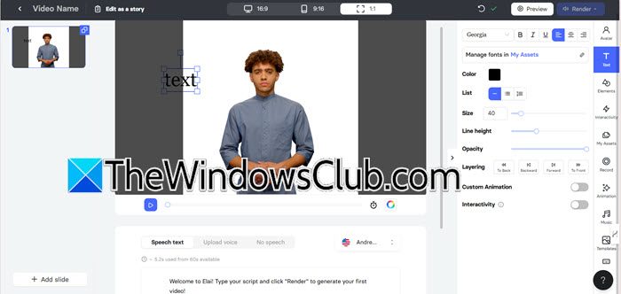 - Finalmente, elige tu avatar, relación de aspecto, ingresa tu texto y crea tu video AI.