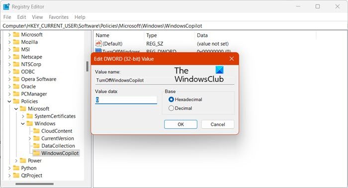 - Nombra el valor recién creadoApagarWindowsCopilot,haga doble clic en él e ingrese '0' en la opción Establecer valor.