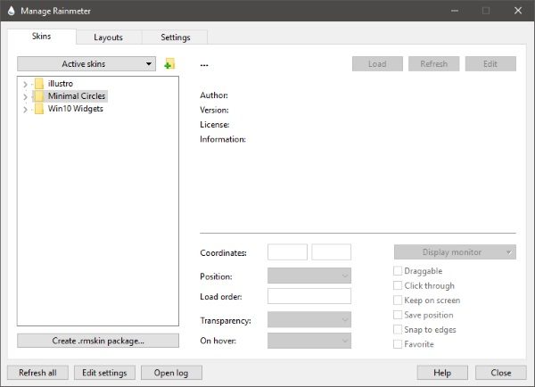 Rainmeter también admite diseños, puede guardar diseños y utilizarlos en el futuro. Los diseños almacenan varias configuraciones y posiciones relativas de diferentes máscaras en su escritorio.