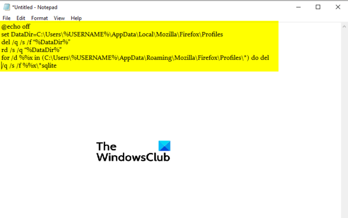 El proceso de eliminar datos del historial de navegación en Firefox es el mismo que hicimos con Google Chrome. La única diferencia son los comandos en el archivo por lotes del Bloc de notas. En este caso, escriba o copie y pegue los siguientes comandos en el Bloc de notas: